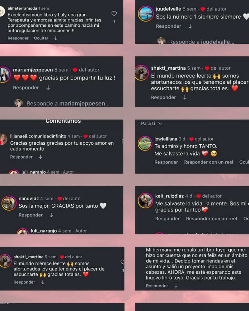 Hola! Soy Lucía Naranjo, Licenciada en Psicología (especializaciones en ansiedad y terapia tcc), instructora en mindfulness, actriz y escritora. Multipasional y con un propósito firme: hablar sobre salud mental y crear herramientas que puedan ayudar a gestionar las emociones.